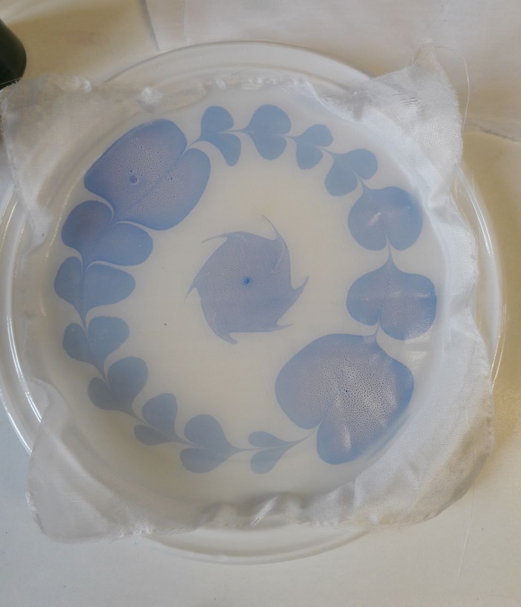 Nog een tip. Voor de grotere lapjes had ik een mooie, niet te diepe zwarte bak gevonden. Nou dat marmert dus helemaal niet fijn omdat je het patroon niet kunt zien door de donkere ondergrond. Geen nood, je kunt een stuk aluminiumfolie op de bodem leggen en dat lost dat probleem helemaal op. Als je niet perse een groot stuk wilt marmeren, kun je ook gebruikmaken van een wegwerpbordje. Op de witte ondergrond kun je goed zien wat er gebeurt, je hebt niet veel marmergrond nodig en als kers op de taart ontstaat er vanzelf een mooie ronde afdruk die je zo in een borduurring klikt. Ingelijst, ophangen en klaar ben je.
